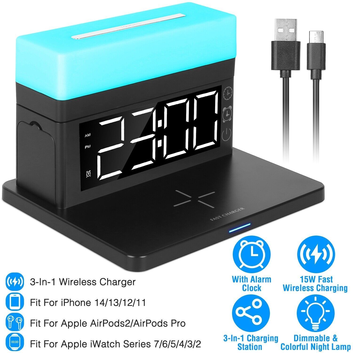 3-In-1 15W Fast Wireless Charging Station Dock 7-Color Flashing Alarm Clock Lamp