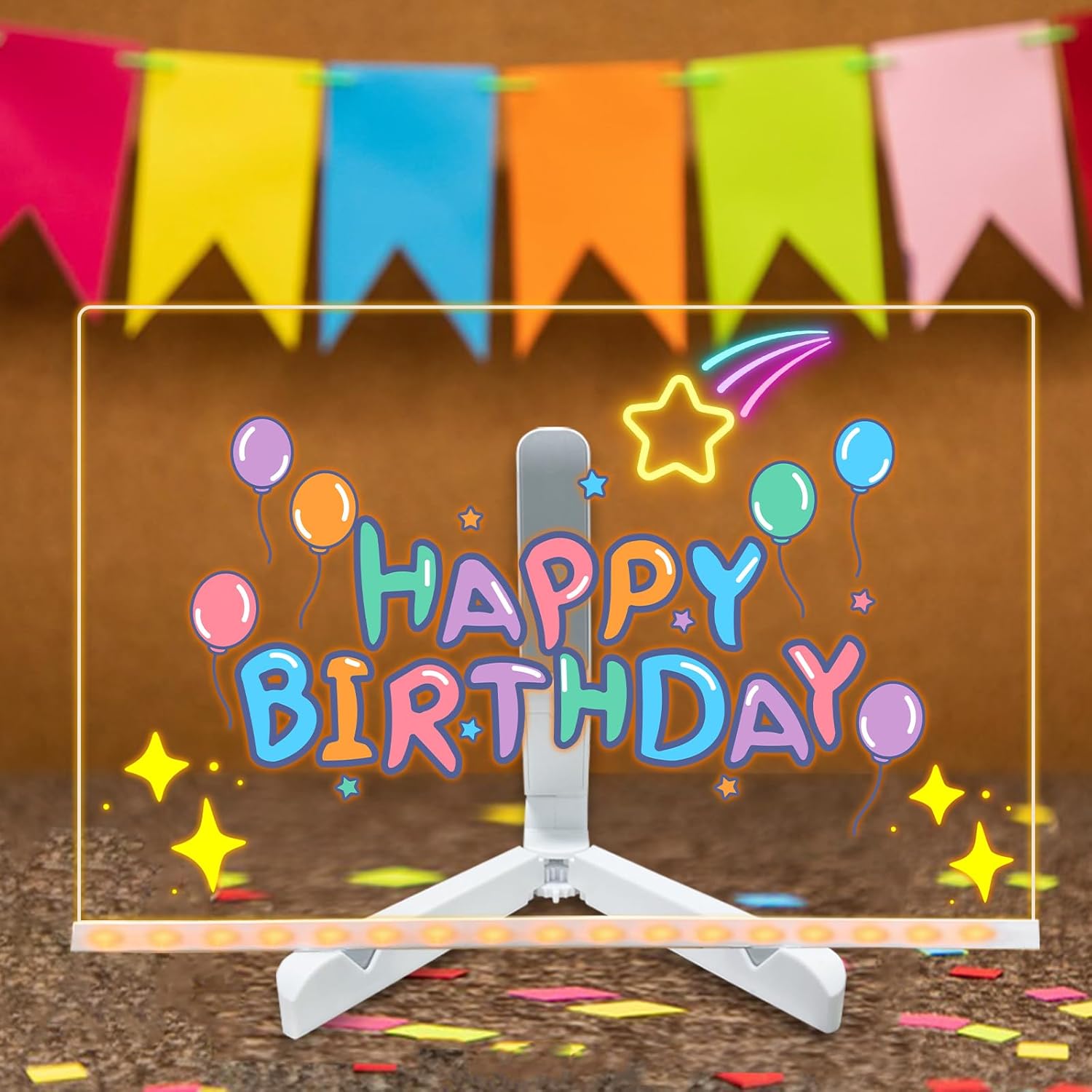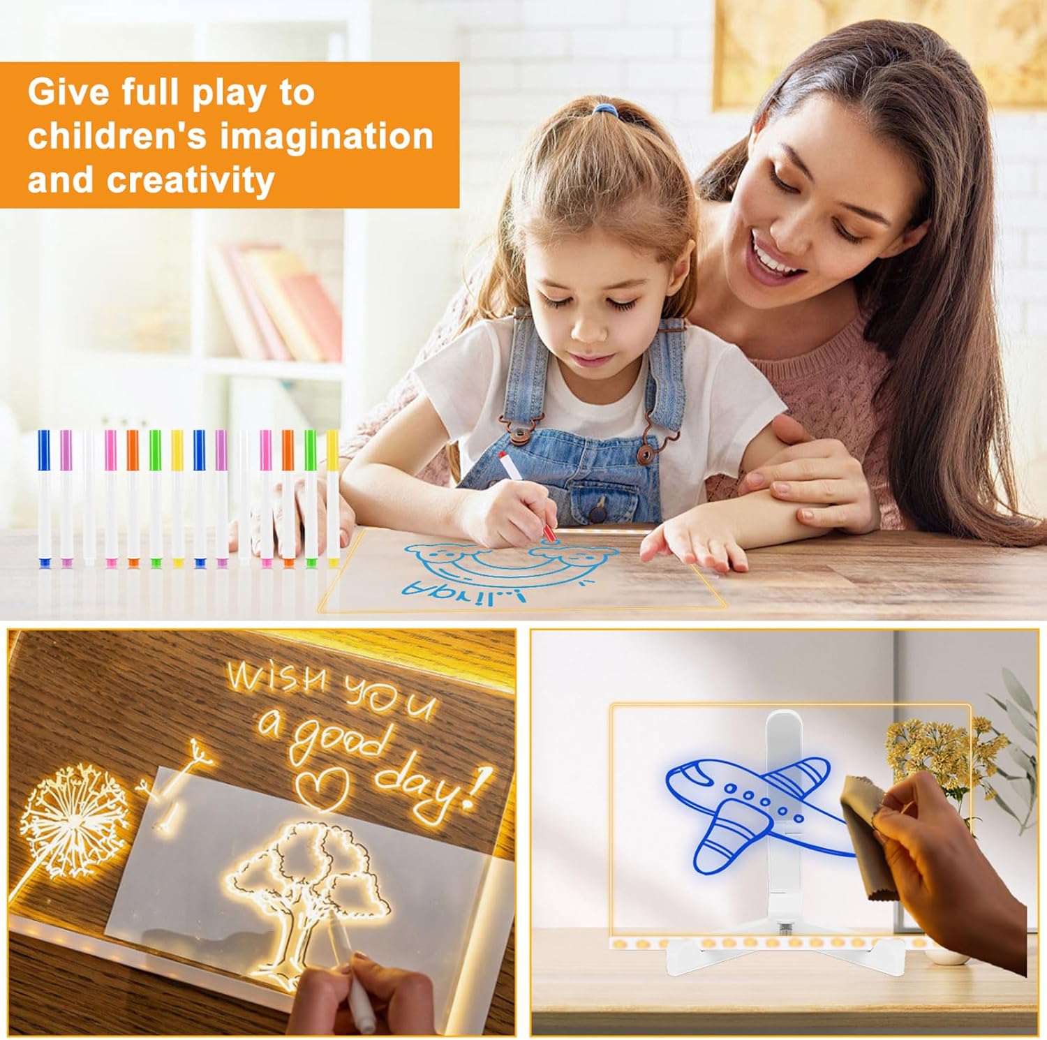 - Away from Screens: Clear acrylic dry erase board with light, it's cute and light design makes it appealing to children of all ages. You can create your artwork directly with 7 highlighters. It's not just a toy, but also a learning tool that stimulates creativity, imagination, concentration, and thinking ability. Keep your kids away from electronic screens.