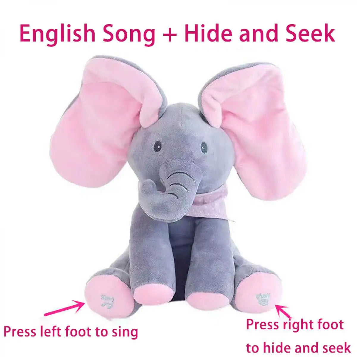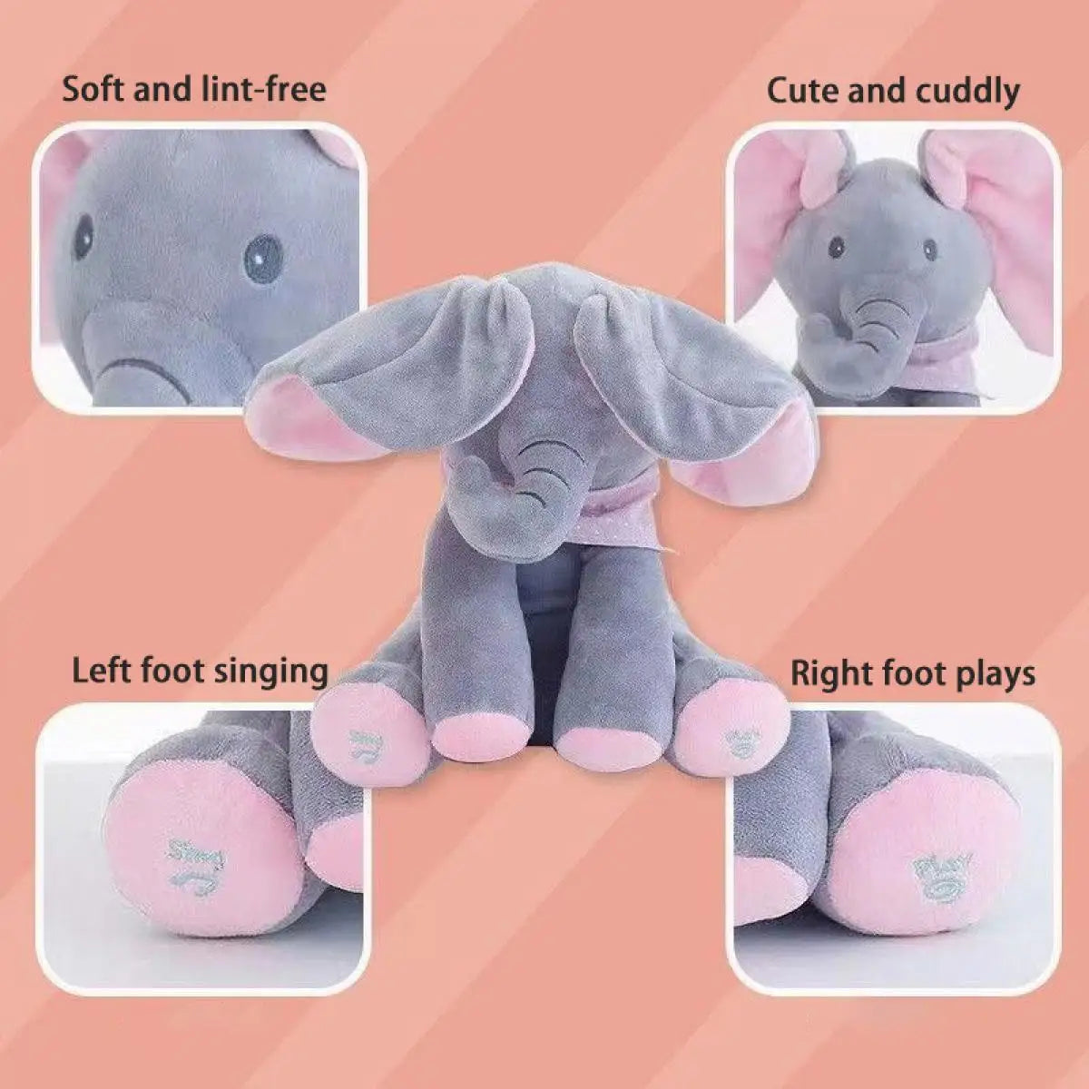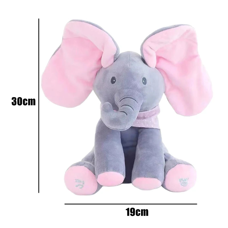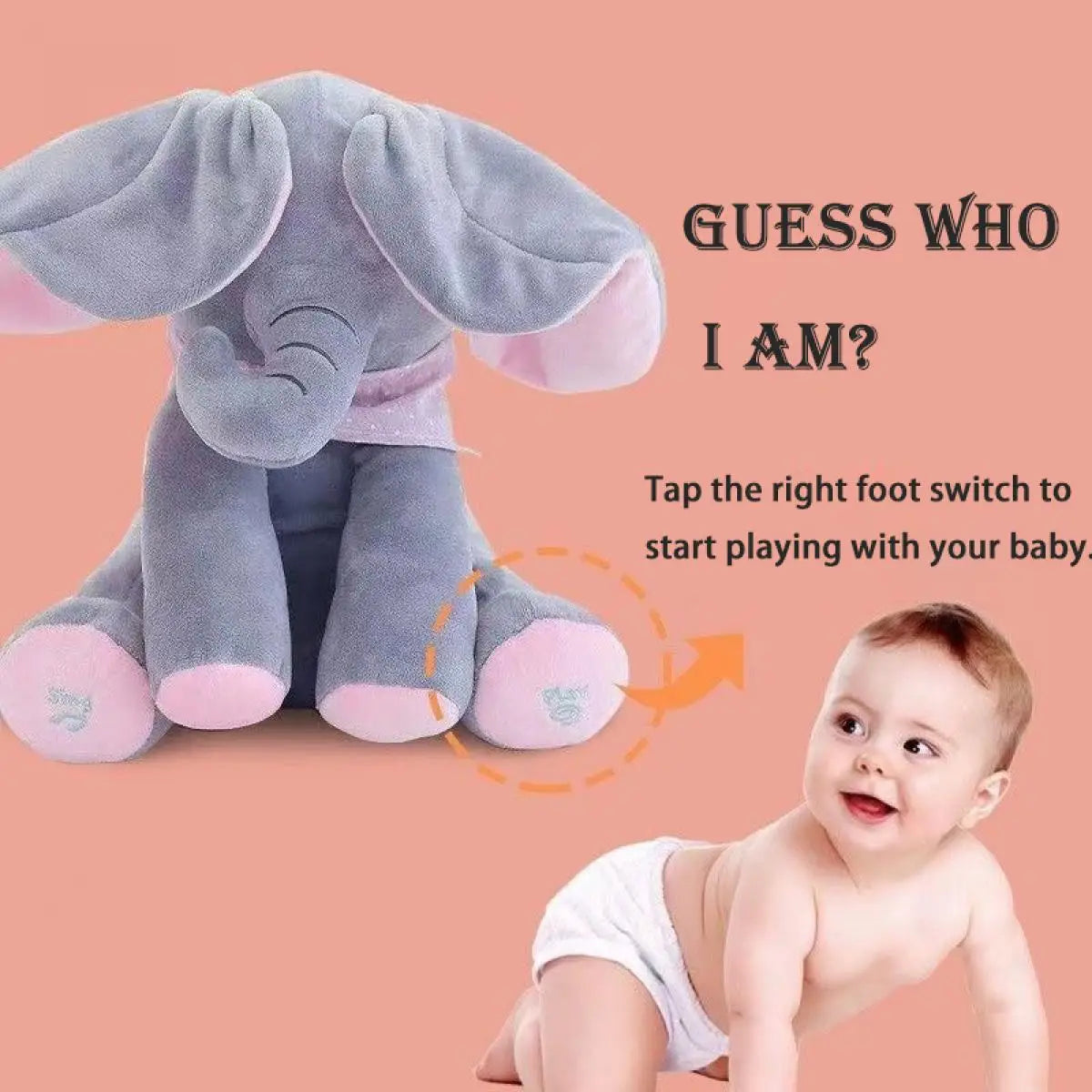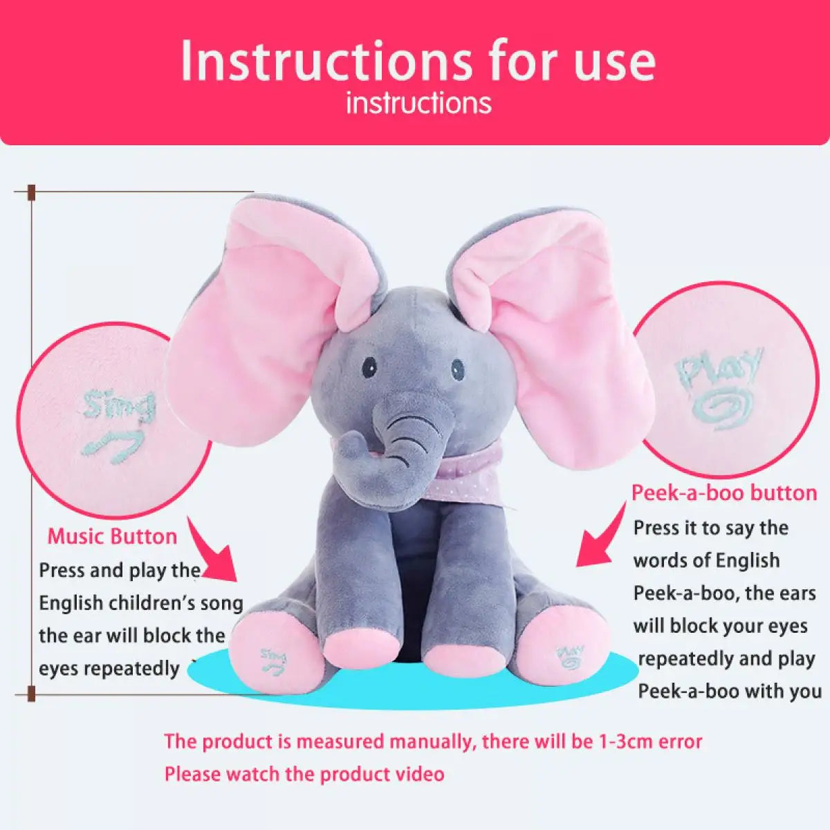 - Interactive Peek-A-Boo Play: Press the elephant's left foot to activate its ears, which rhythmically move up and down, playing a delightful game of peek-a-boo with your child.