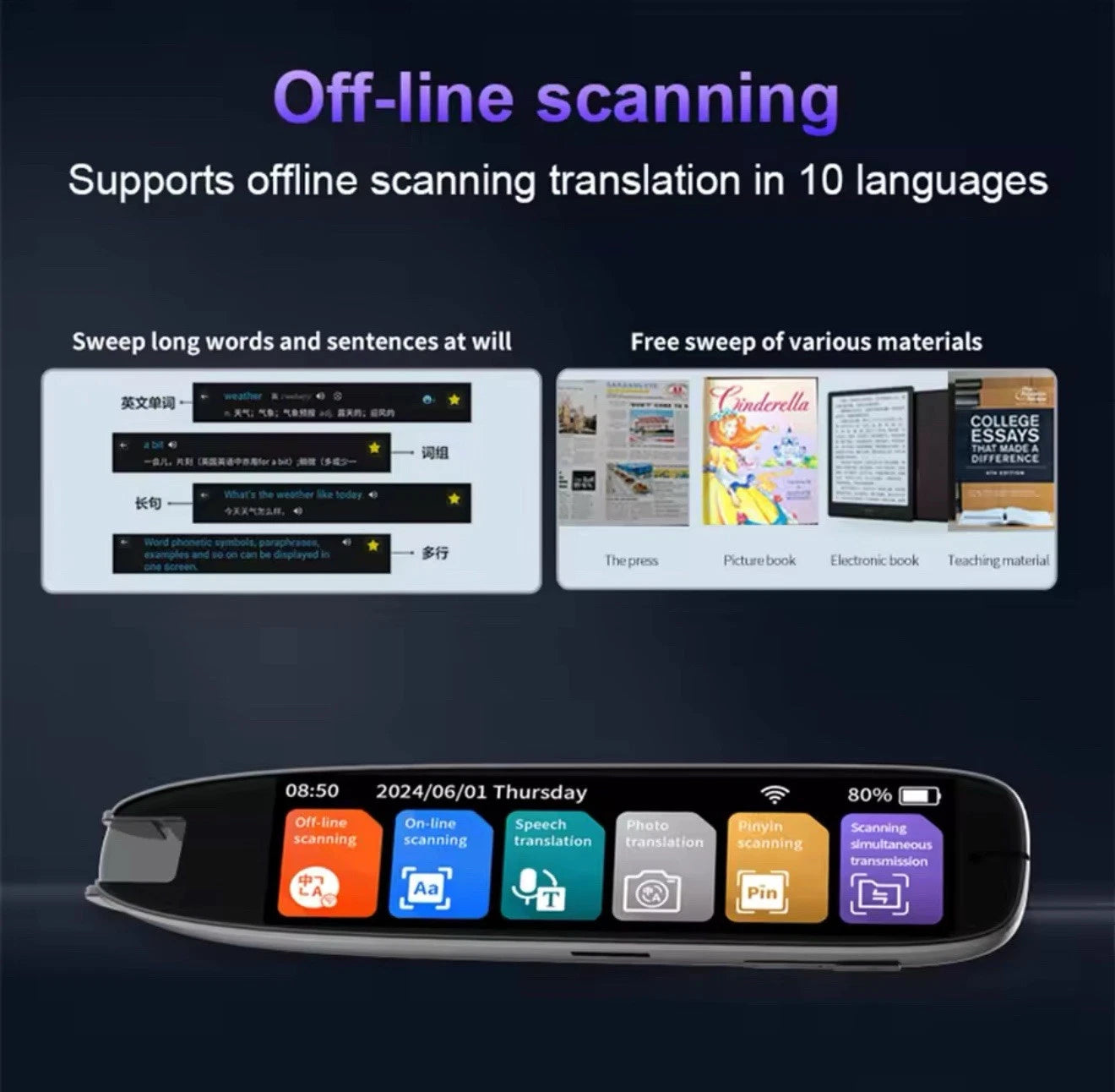 - 10 Languages Offline Translation The translation pen supports offline translation in 10 languages, including English, Spanish, French, and more. This feature is invaluable for travelers in areas without internet access or students studying in remote locations. It’s the ideal tool for anyone needing reliable translations when there’s no Wi-Fi, including those using a reading pen for quick offline language support. This translation device ensures you're never lost in translation.