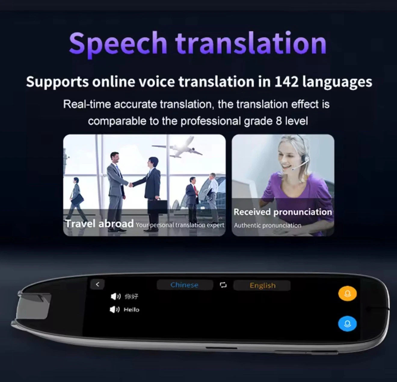 - Two Way Language Translation With two-way language translation, this reading pen enables smooth real-time communication in multiple languages, whether you're in business meetings, interviews, or social interactions. It helps you converse seamlessly with people from different backgrounds, making it an essential tool for language learners and travelers. This versatile translation device ensures effective communication across language barriers.