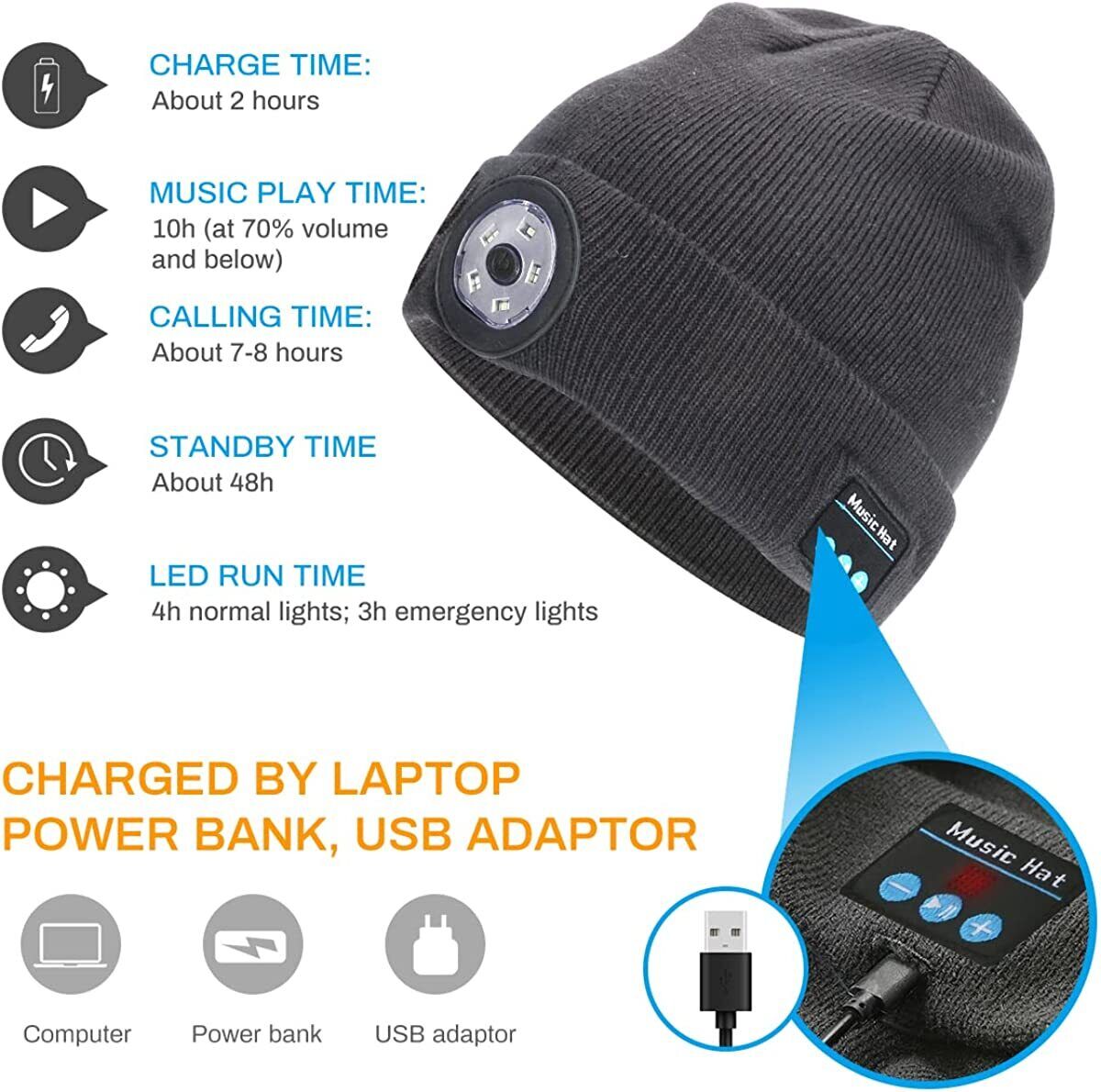 - Upgraded LED Headlight Beanie This wireless hat has 5 rechargeable high light LEDs, with 3 updated adjustment modes: 50% brightness, 100% brightness, red and blue emergency lights, you can choose different levels of brightness according to the environment or use the red and blue emergency lights when you are in an emergency. Perfect for every who likes going in the outdoors.